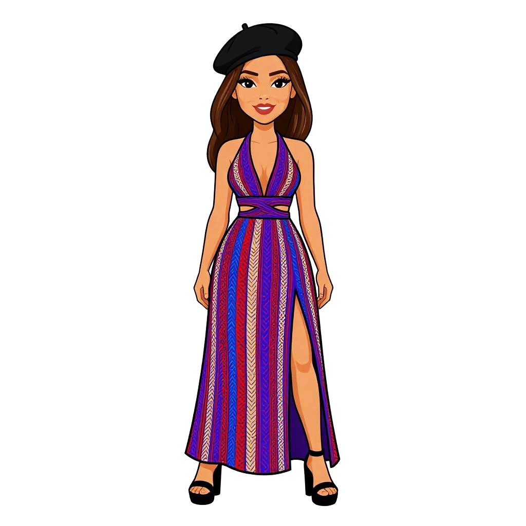 Woman with pretty face and pretty hair. Woman, boho-chic, off-the-shoulder midi dress with multi-colored vertical stripes, short puffed sleeves, cinched waist with a thin black belt, tiered ruffle hemline, paired with black open-toe platform sandals, white studio background. --sref 1467