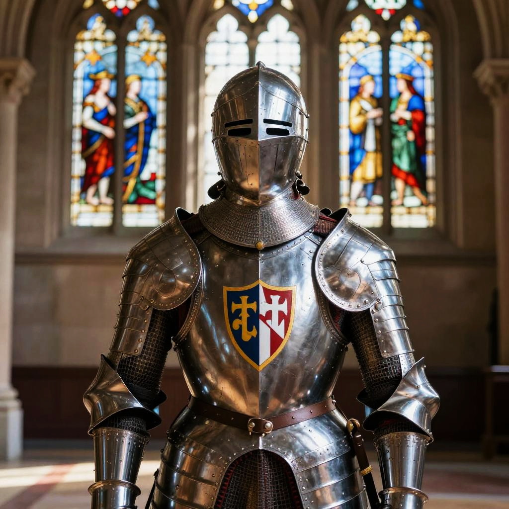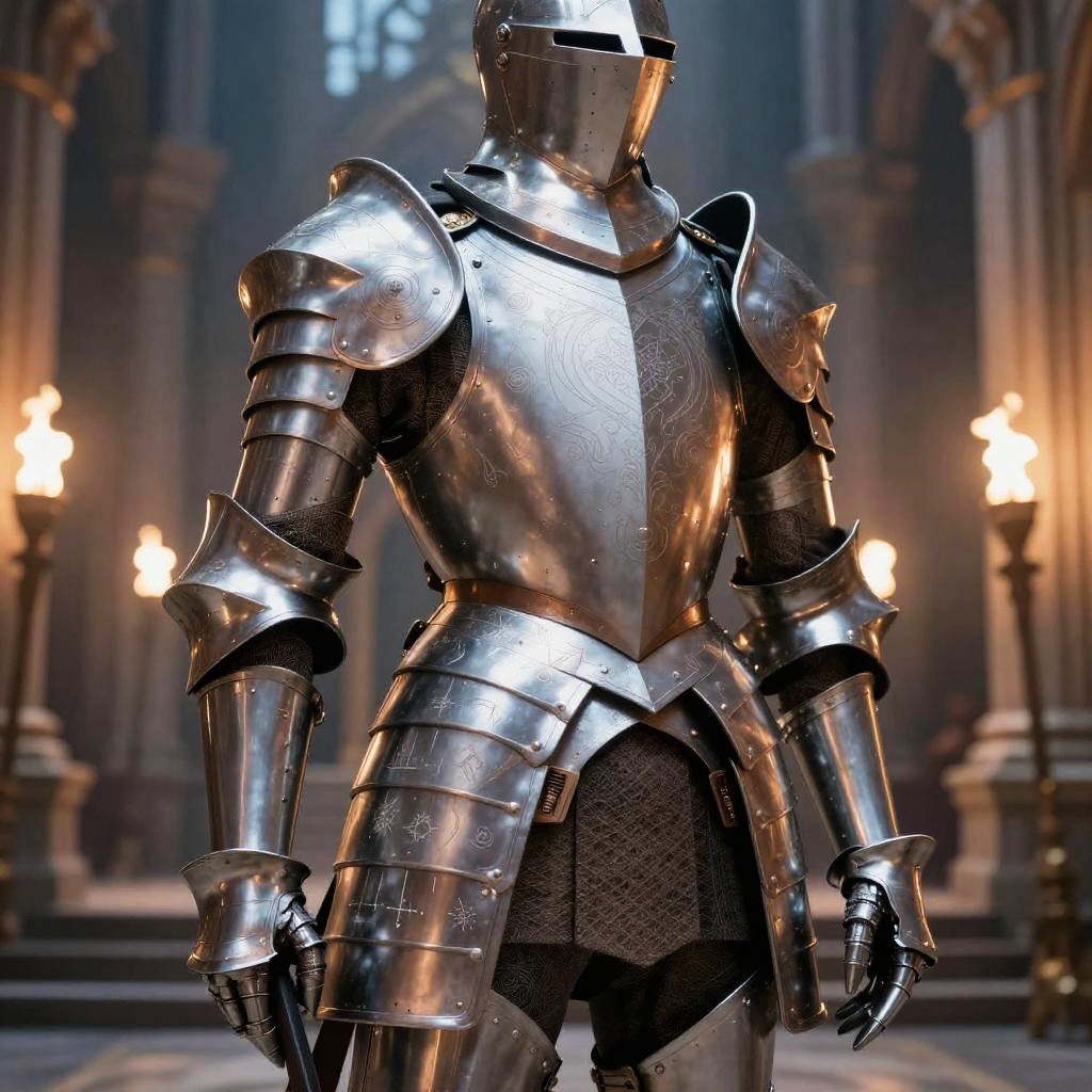 Close-up of platemail armor, showcasing the fine craftsmanship of overlapping steel plates, rivets, and leather straps, set against a dark, blurred background to highlight the texture and reflections of the metal in soft diffused light.