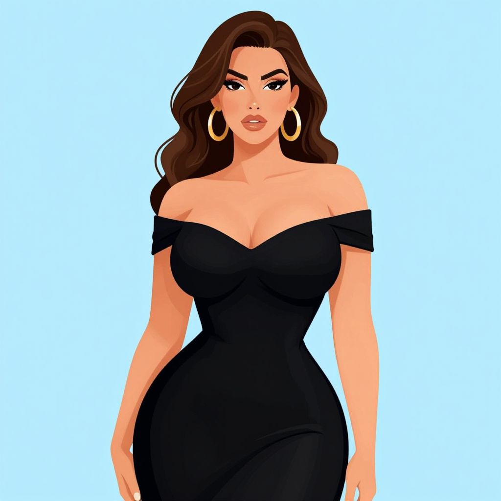 Digital illustration of a curvy woman with long brown hair, wearing a black off-shoulder dress and large gold hoop earrings, against a light blue