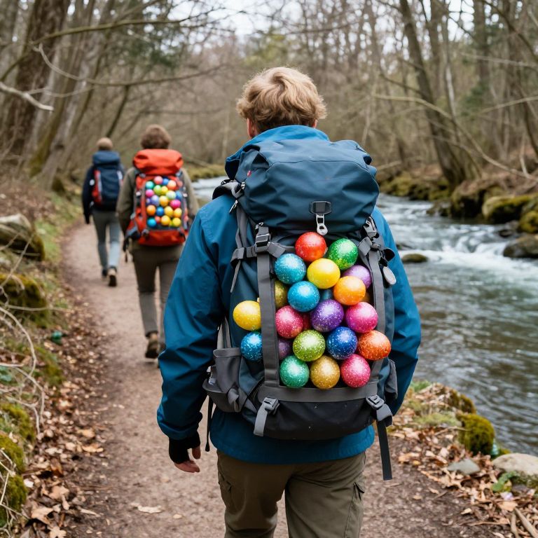 Manual Mode hikers an a path in the woods beneath a river, hikers have backpacks full of colourfull easter eggs,