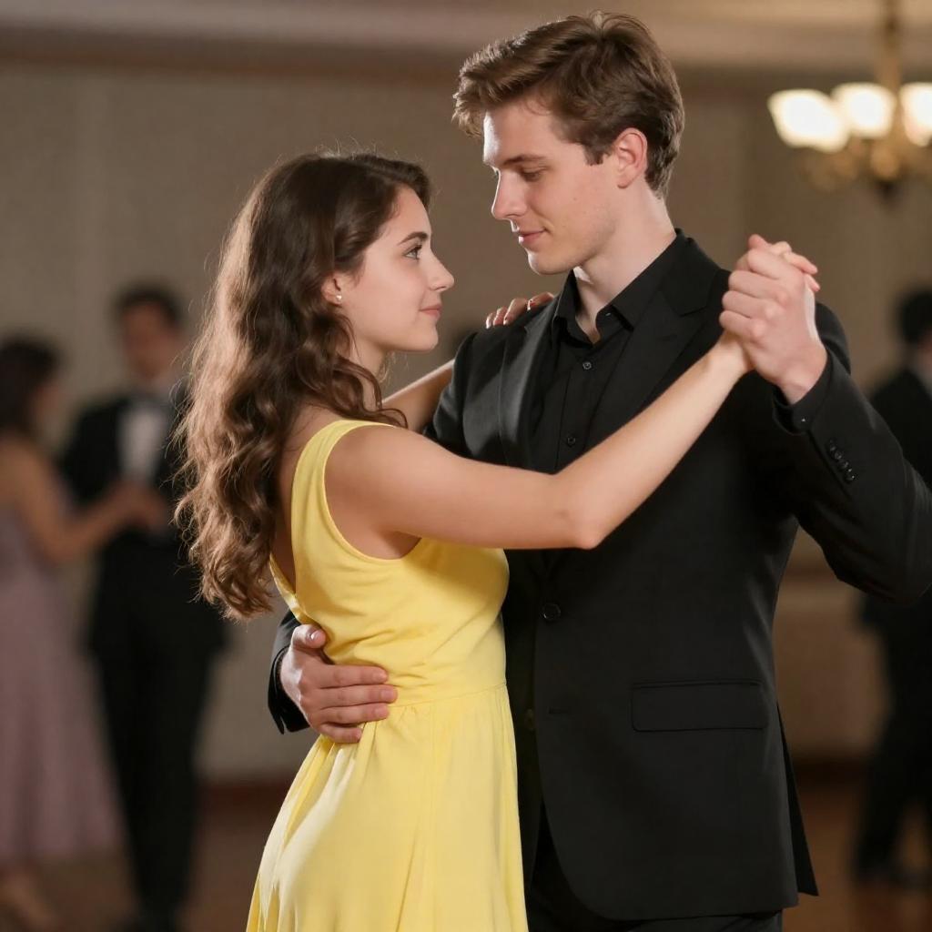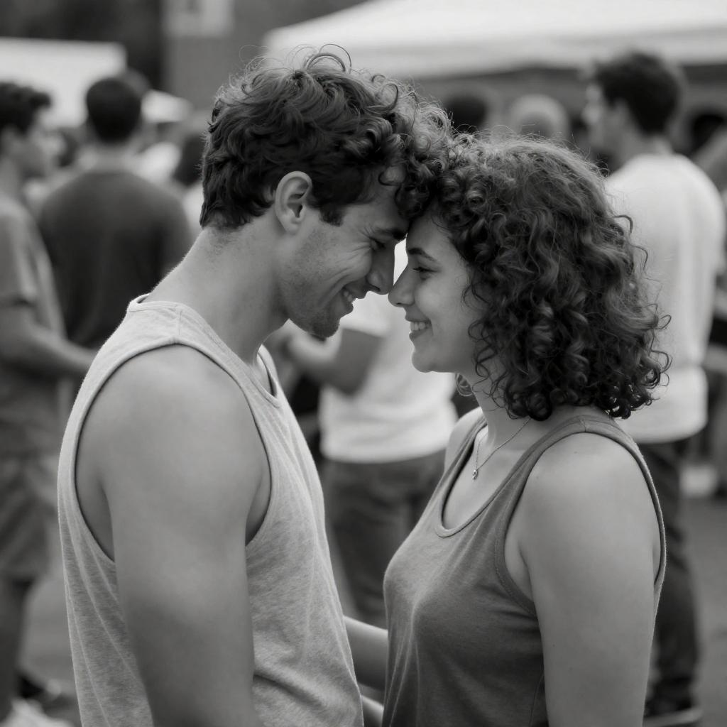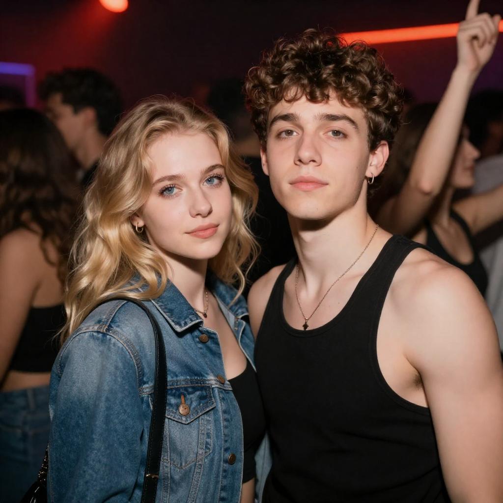 Photograph of a young couple dancing closely. Woman with short brown hair, light skin, gray tank top, necklace, smiling widely. Man with short brown hair, light skin, black t-shirt, smiling, raising arm. Blue and pink light in background. Other people with raised arms in the background. Energetic, joyful expressions.