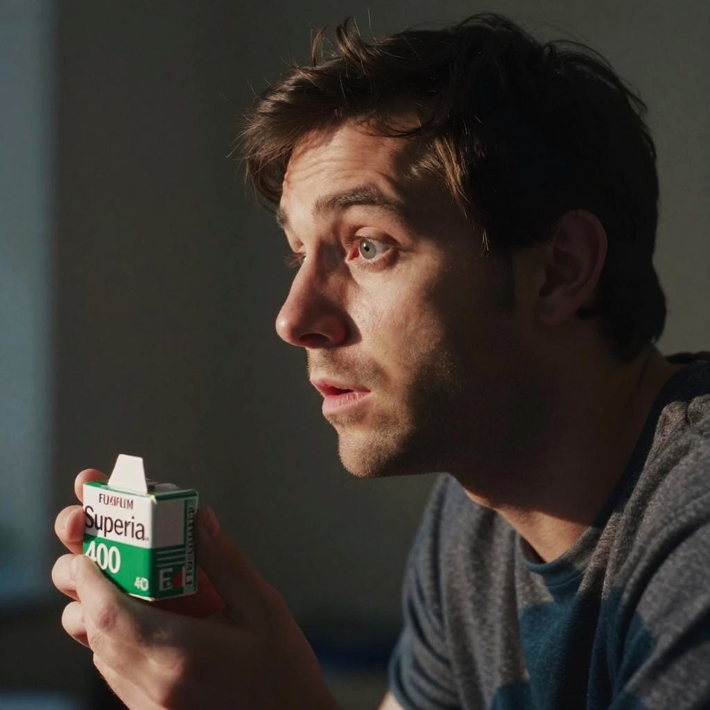 Photograph, Side lighting, soft light, F/1.8, Polychromatic, cinematic lighting, Fuji superia 400, side light, Hairy Krakow, Agfacolor, confused, looking around scared
