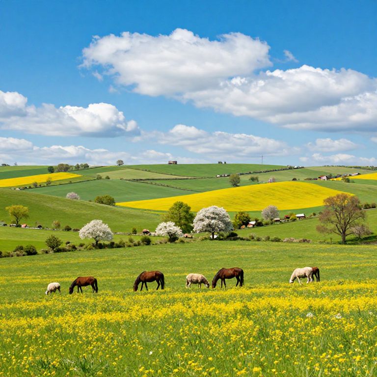 Hude countryside with rolling hills and traditional farms, grazing sheep and horses, bright springtime colors with blooming wildflowers, blue sky with fluffy clouds, panoramic view, peaceful and vibrant rural life