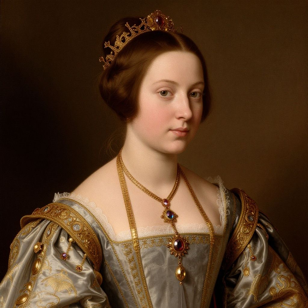 This is a detailed, classical portrait painting of a fair-skinned woman with dark hair, styled in a modest updo, wearing a gold and brown, intricately patterned Renaissance dress with puffed sleeves and a white lace collar. She has a red and gold pendant necklace and a small tiara on her head. The dark background highlights her serene expression and elegant attire.