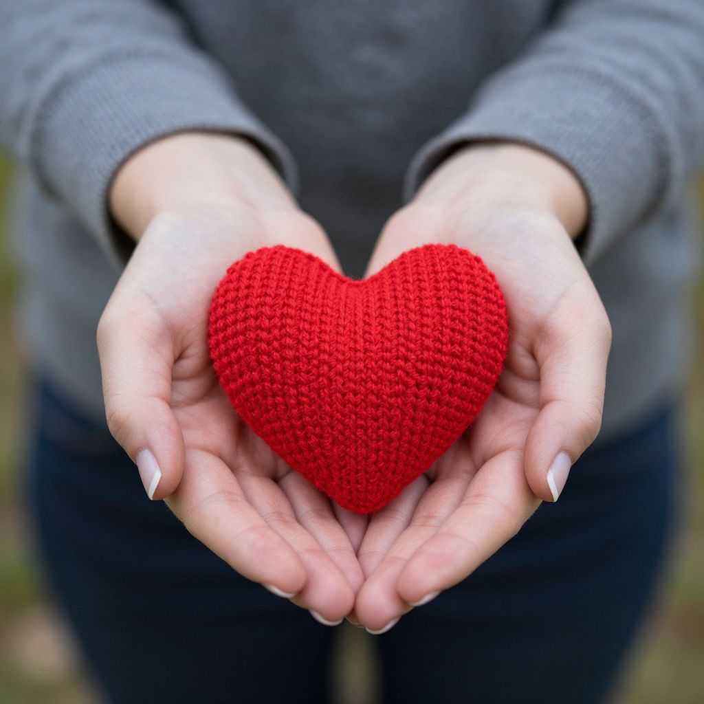 Red woolen heart in hand of woman in outdoor royalty free stock images