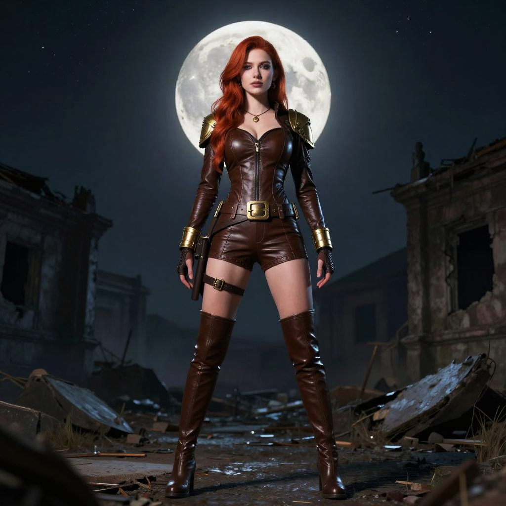 Photograph-style CGI of a confident, sexy woman with long red hair standing in a dark, starry night with a bright full moon behind her. She's wearing a tight, brown leather outfit with gold armor accents, thigh-high boots, and a belt with a large buckle. The background shows an old, ruined building and debris on the ground, adding a gritty, post-apocalyptic vibe.