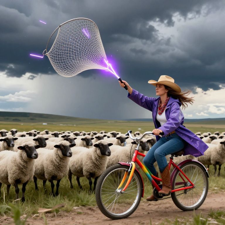 Storm clouds are herded like sheep by a raincoat-clad cowgirl on a rainbow-dappled bicycle, collecting thunderbolts in a giant net.
