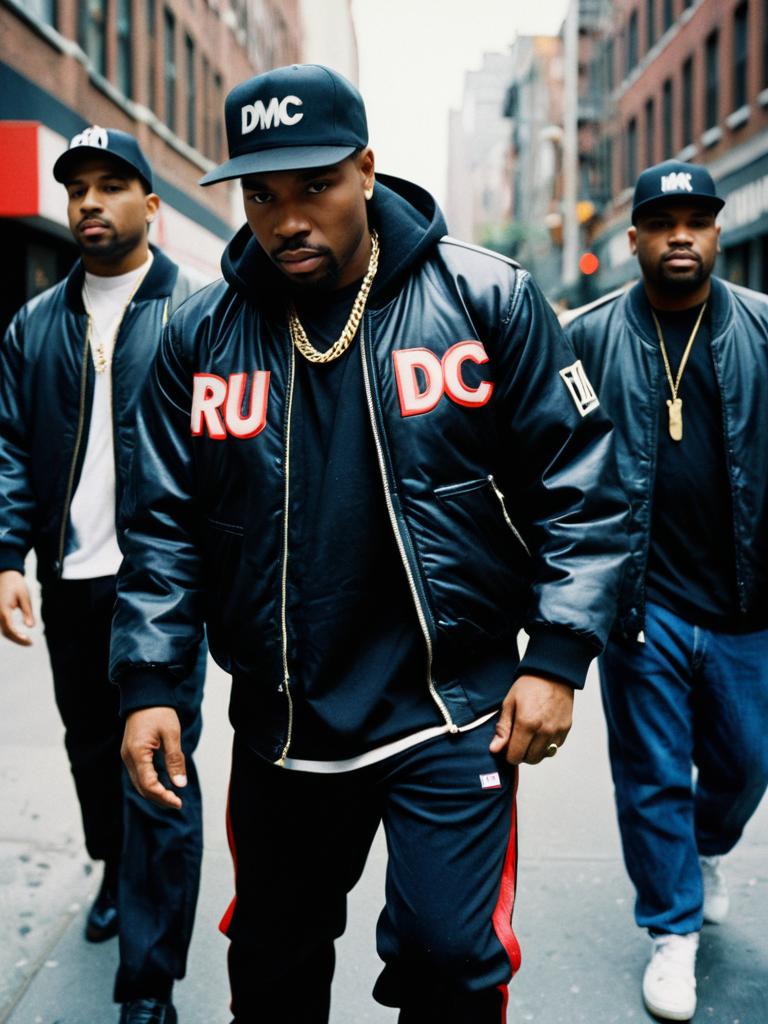 Man in Run DMC Costume, cinematic realism, urban editorial portrait