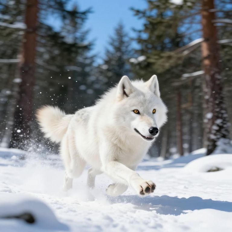 Photograph of a white wolf sprinting through a snowy forest, with snowflakes flying around, tall pine trees in the background, and a bright