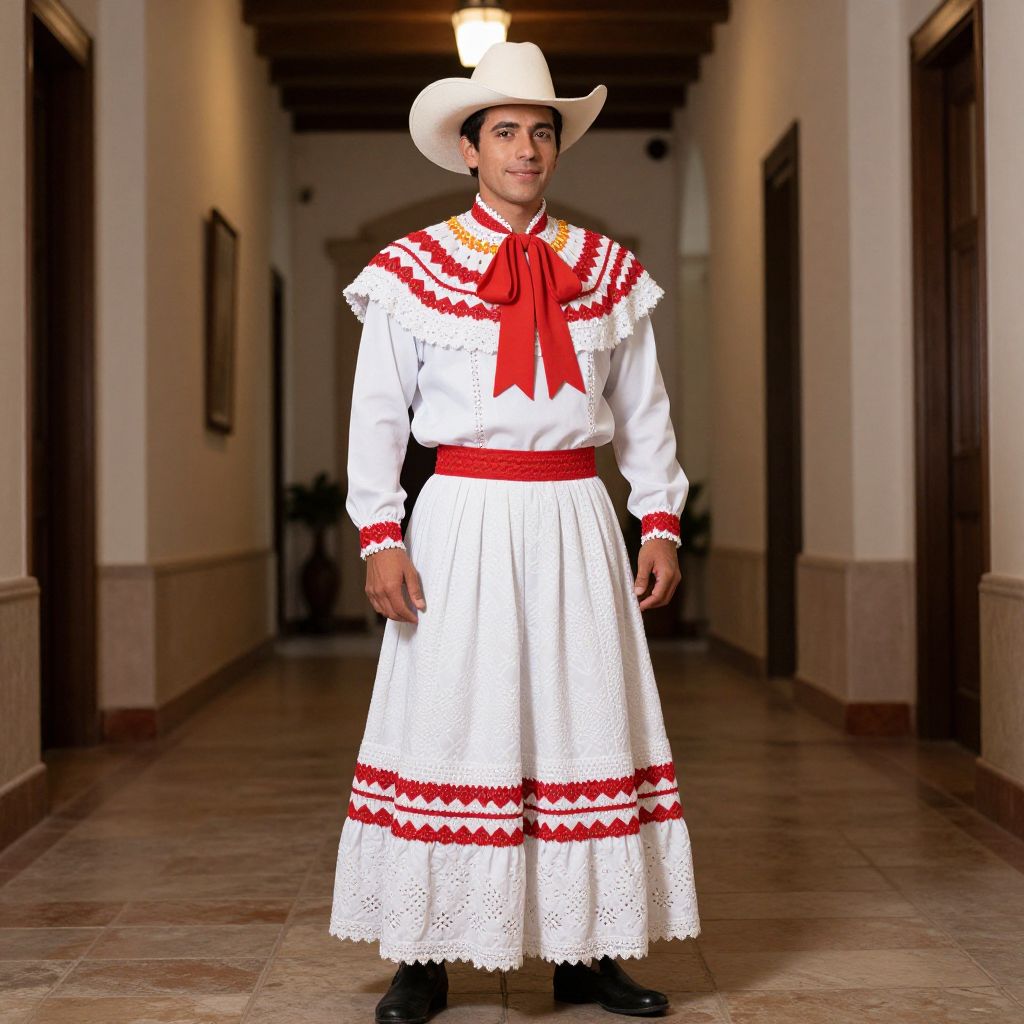 Encanto Camilo Costume, dressed in a traditional indian costume standing in a hallway