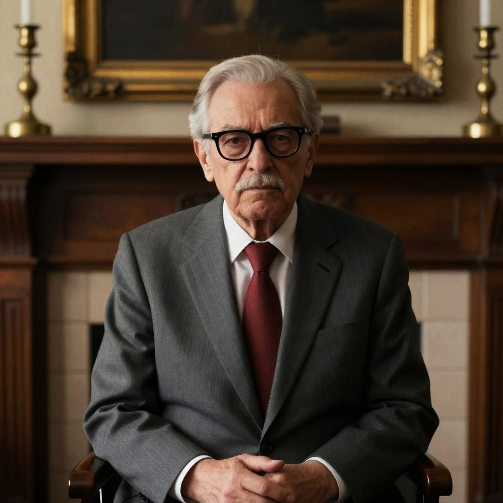 Elderly man with gray hair, mustache, and black glasses, wearing a gray pinstripe suit and red tie, sits in front of a wooden fireplace with a tile background. Hands clasped, serious expression. Gold-framed painting above, brass candlesticks on mantel.