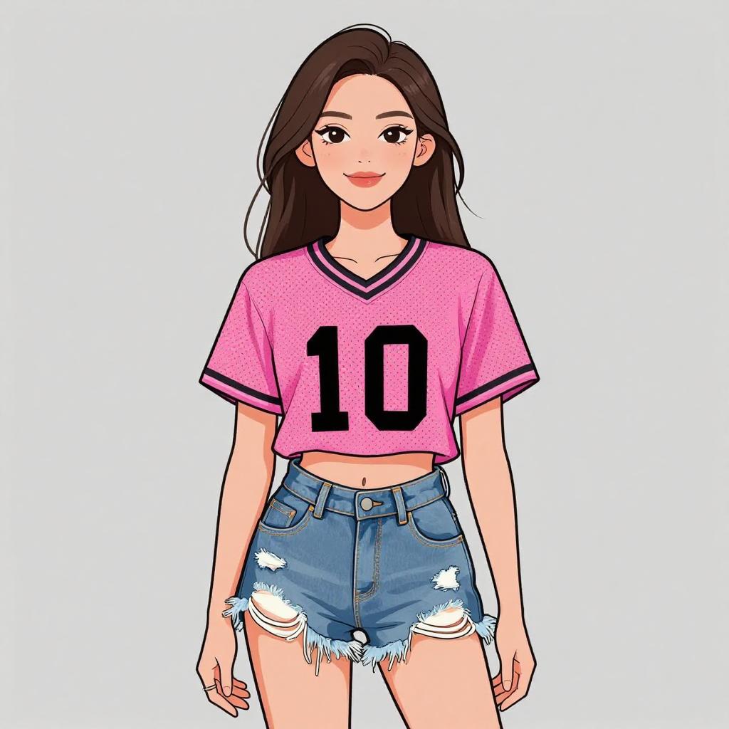 Woman with pretty face and pretty hair. smiling Woman, sportswear, mesh jersey with short sleeves in bright pink, large black number '10' printed on the front, crew neck, cropped length, distressed denim shorts, frayed hem, blue with a light wash, mid-rise waist. --sref 1467