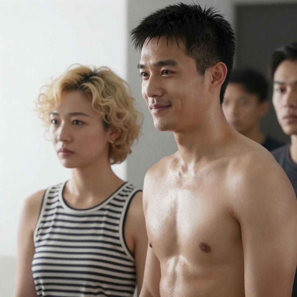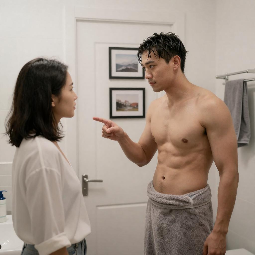 Shirtless man with wet hair, muscular build, gray towel around waist, stands in bathroom, pointing at woman with shoulder-length dark hair, white shirt, looking at him. Bathroom has white door, framed pictures, mirror, towels on rack, toiletries.