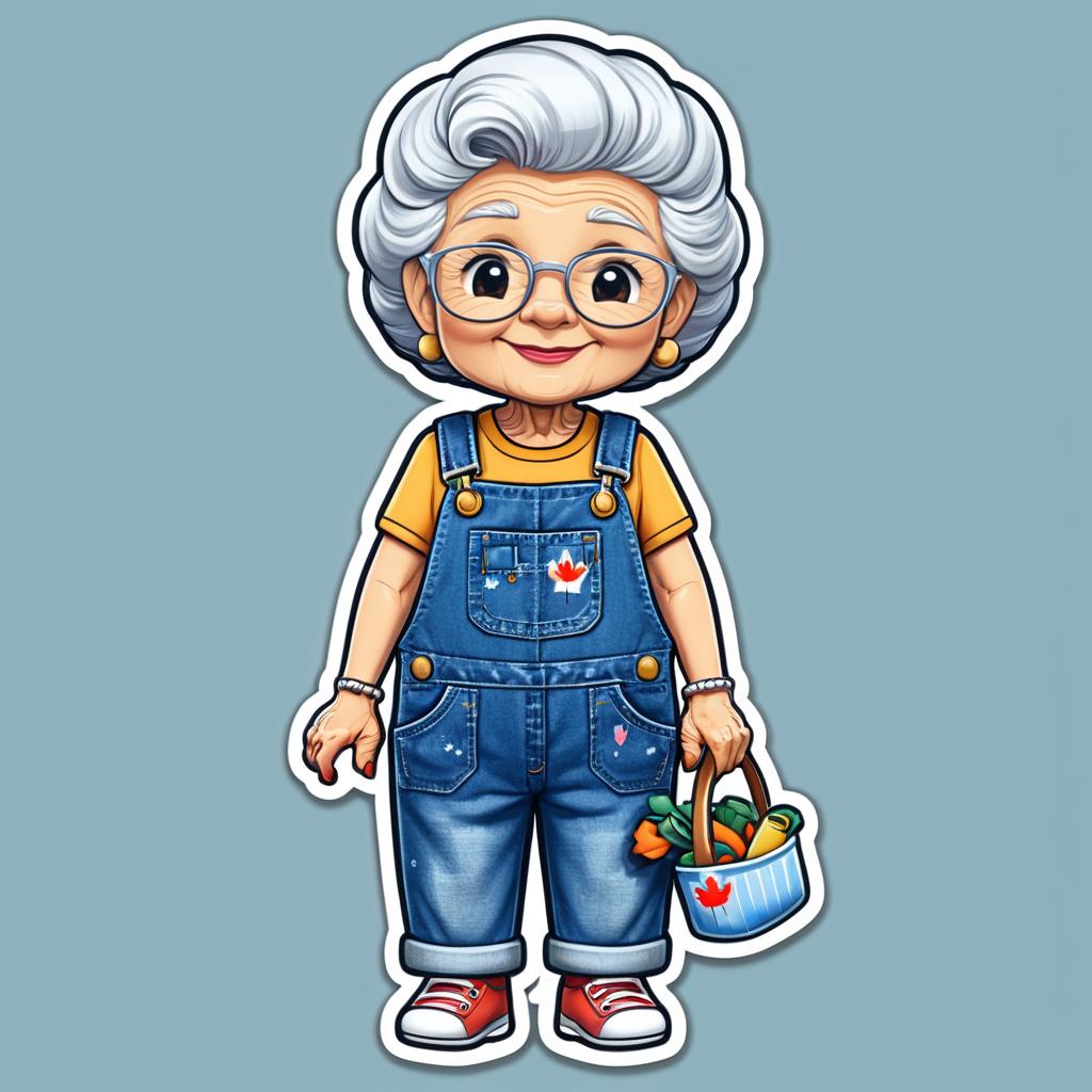 3D-stylized chibi cartoon character of a cheerful, endearing grandmother with gray hair, wearing a simple sleeveless blue checkered dress and white apron. She holds a spatula, symbolizing household chores. Character design features a large white hat, pink shoes, and orange earrings, consistent with kawaii and digital sticker styles.