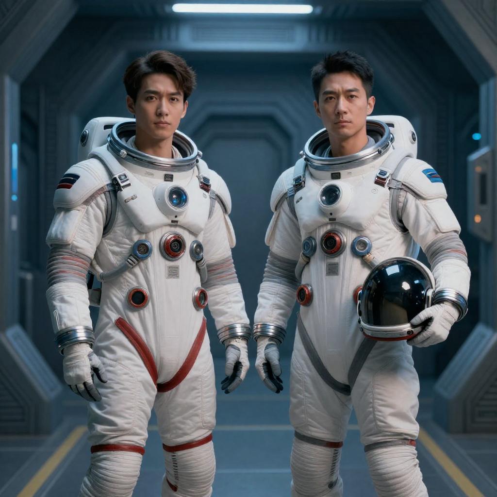 Portrait of two Asian men standing in a futuristic metallic tunnel with blue lighting. Both wear white spacesuits with multiple circular details and padded designs. The man on the left has dark hair and red accents on his suit, while the man on the right has short black hair, holds a black space helmet, and has gray accents on his suit. The background features glowing blue lights and intricate metallic patterns, suggesting a sci-fi or space exploration setting.