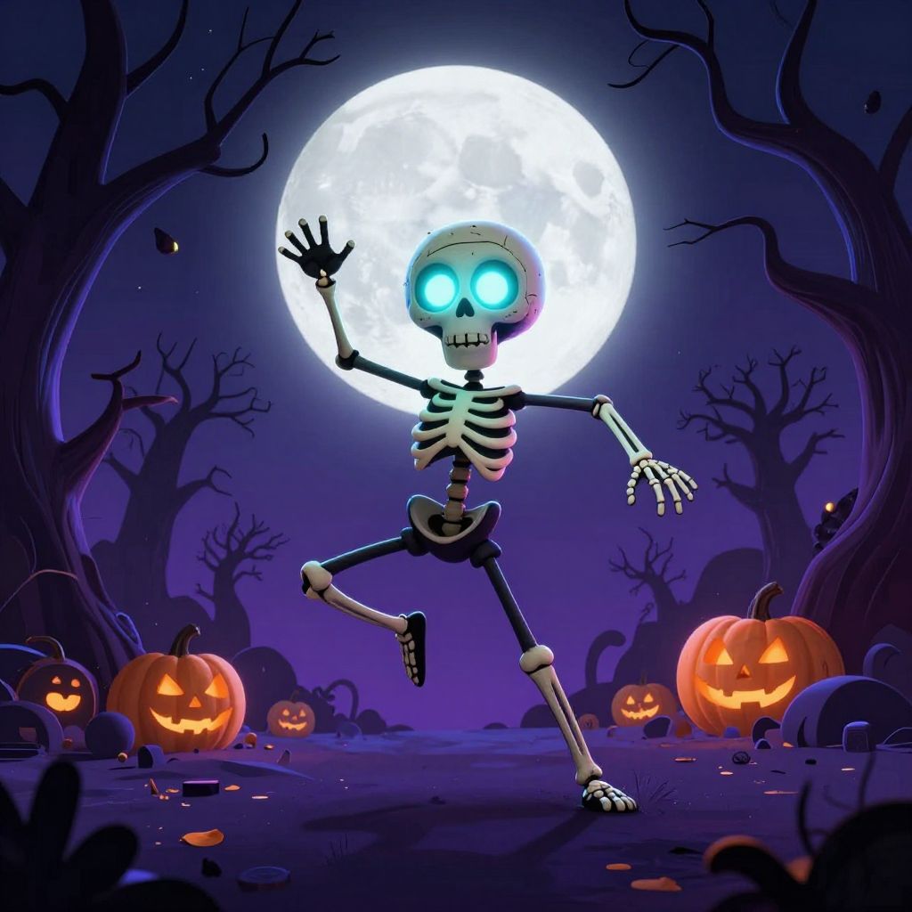 Skinny skeleton cartoon dancing under moonlight, glowing eyes, surrounded by stylized spooky trees, bright neon colors, energetic and fun Halloween animated scene