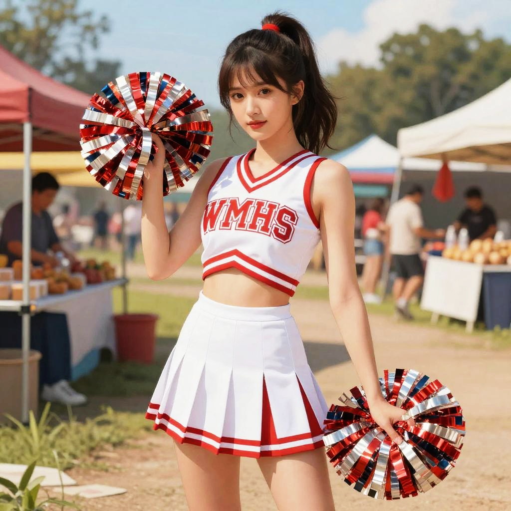 A Hourglass woman in a sporty cheerleader uniform with a red and white color scheme, featuring varsity-style WMHS lettering, a sleeveless v-neck top, and a pleated skirt. She holds two pom-poms in red, white, and silver, wearing white sneakers and sporting a high ponytail. Set in a vibrant outdoor market in a rural countryside, illustrated in the style of IDW Publishing. Sexy. Pretty face and beutiful eyes