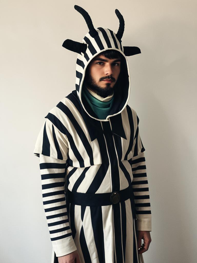Portrait of a young man wearing a detailed Zebstrika cosplay costume. The outfit features black and white striped patterns with a hood designed with two upright ears and two curved horns, mimicking the look of the Zebstrika Pokémon. The man has dark hair and a beard, and stands against a plain light background.