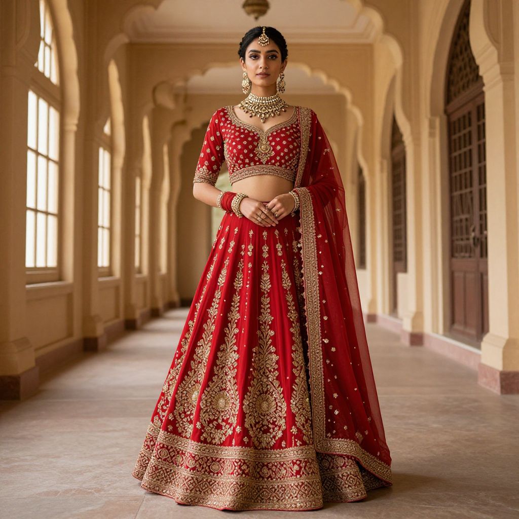 Elegantly poised woman wearing a vibrant red lehenga with intricate gold embroidery, complemented by a matching dupatta and ornate jewelry, stands gracefully in a grand colonnaded hallway with arched windows and columns.