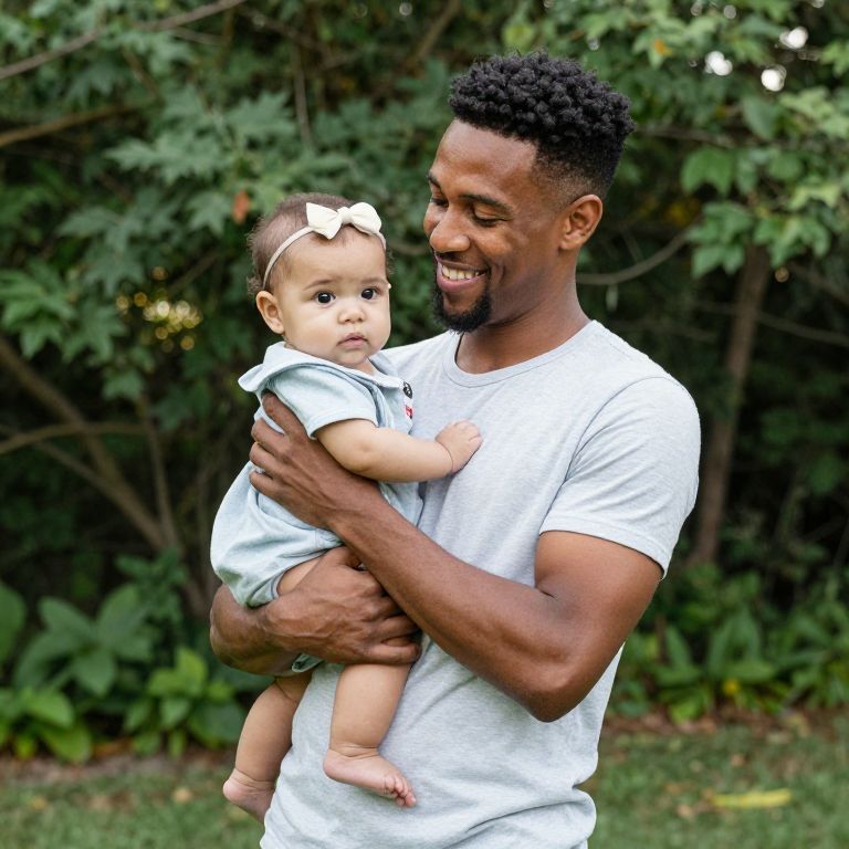 Jeremiah Brent holds his baby Poppy close, smiling warmly as they stand together outdoors amidst lush greenery and trees.