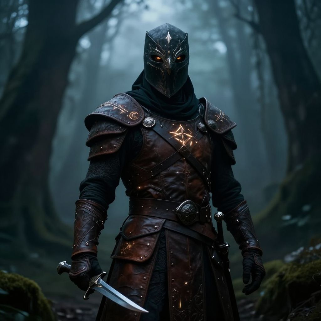 DND masked character standing in a misty enchanted forest, wearing intricate leather armor with glowing runes, mysterious eyes visible through the mask, holding a curved dagger, fantasy art style, dramatic lighting, cinematic atmosphere