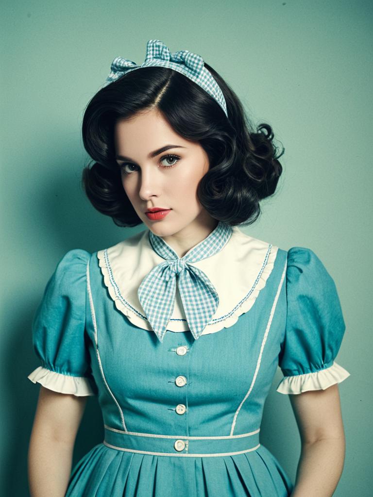 Portrait of a woman with fair skin and dark wavy hair styled in vintage curls, wearing a blue dress with puffed sleeves, white buttons, and a white collar featuring a blue checkered necktie. She also wears a matching blue checkered headband. The look is reminiscent of the character Dorothy Unsworth from cosplay culture.