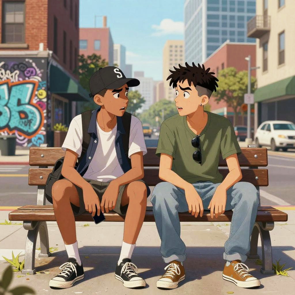 Digital anime-style illustration of two young men, one in a baseball cap and shorts, the other in a green shirt and jeans, sitting on a city
