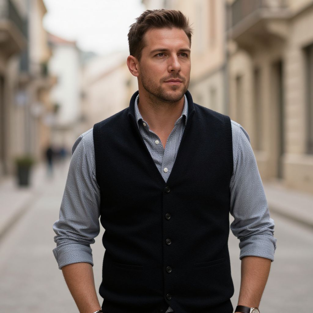 Photograph of a handsome, light-skinned man with short, neatly styled brown hair and a trimmed beard, standing on a narrow, blurred urban street. He wears a light blue, checkered button-down shirt with sleeves rolled up, and a black vest over it, exuding a stylish, modern look. His hands rest casually at his sides, and he has a serious, contemplative expression. The street in the background is lined with beige buildings, with some blurred pedestrians and potted plants visible, creating a soft, urban atmosphere. The image has a shallow depth of field, highlighting the man while blurring the background.