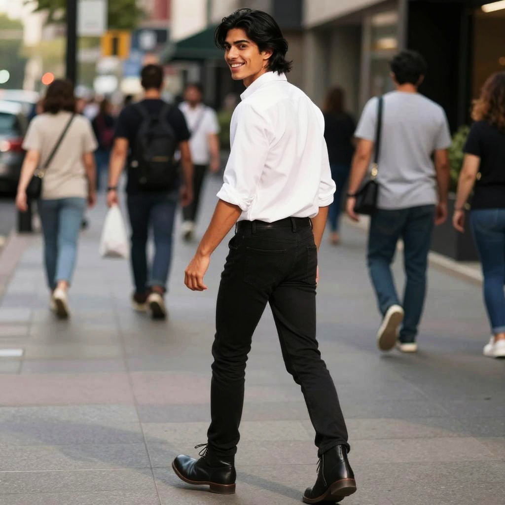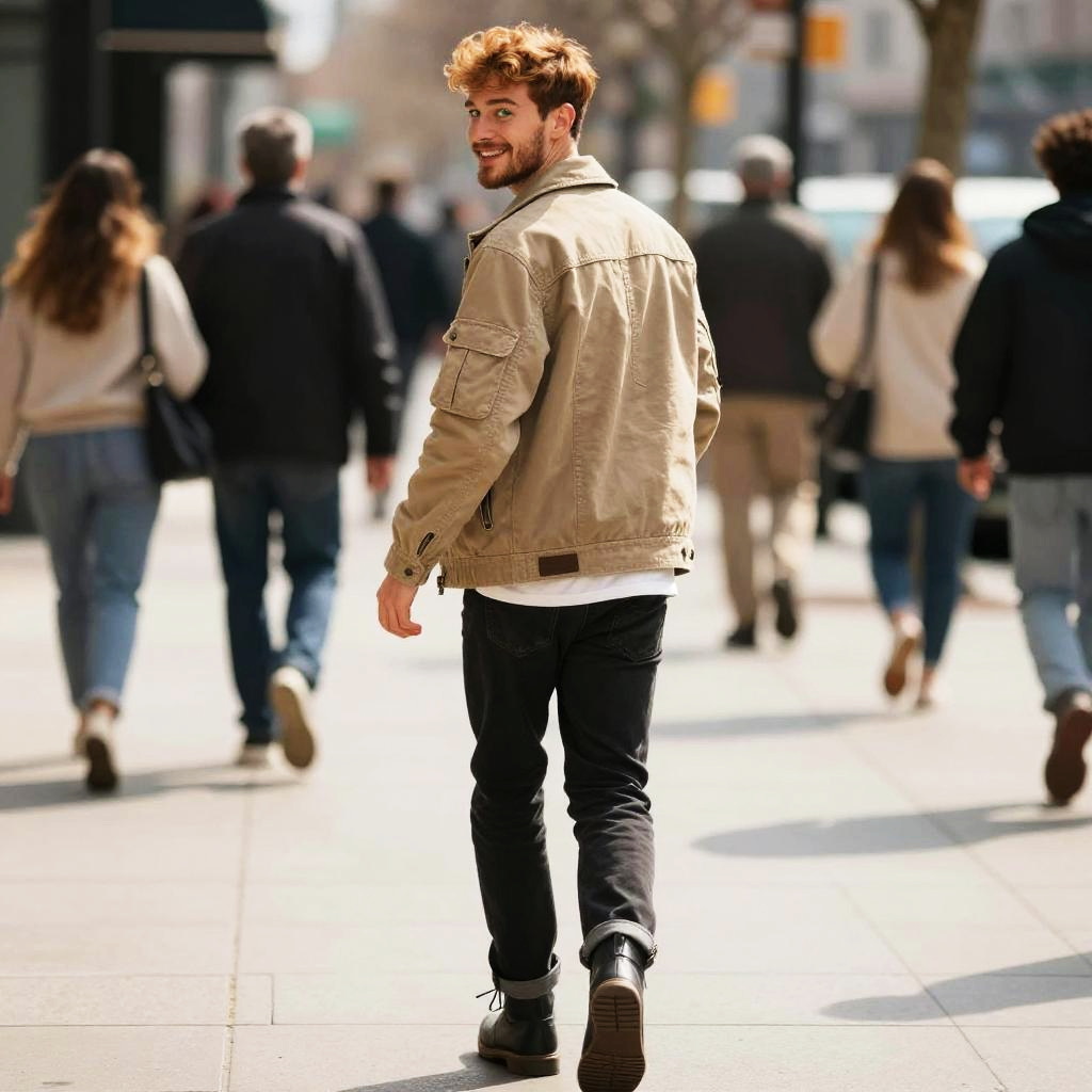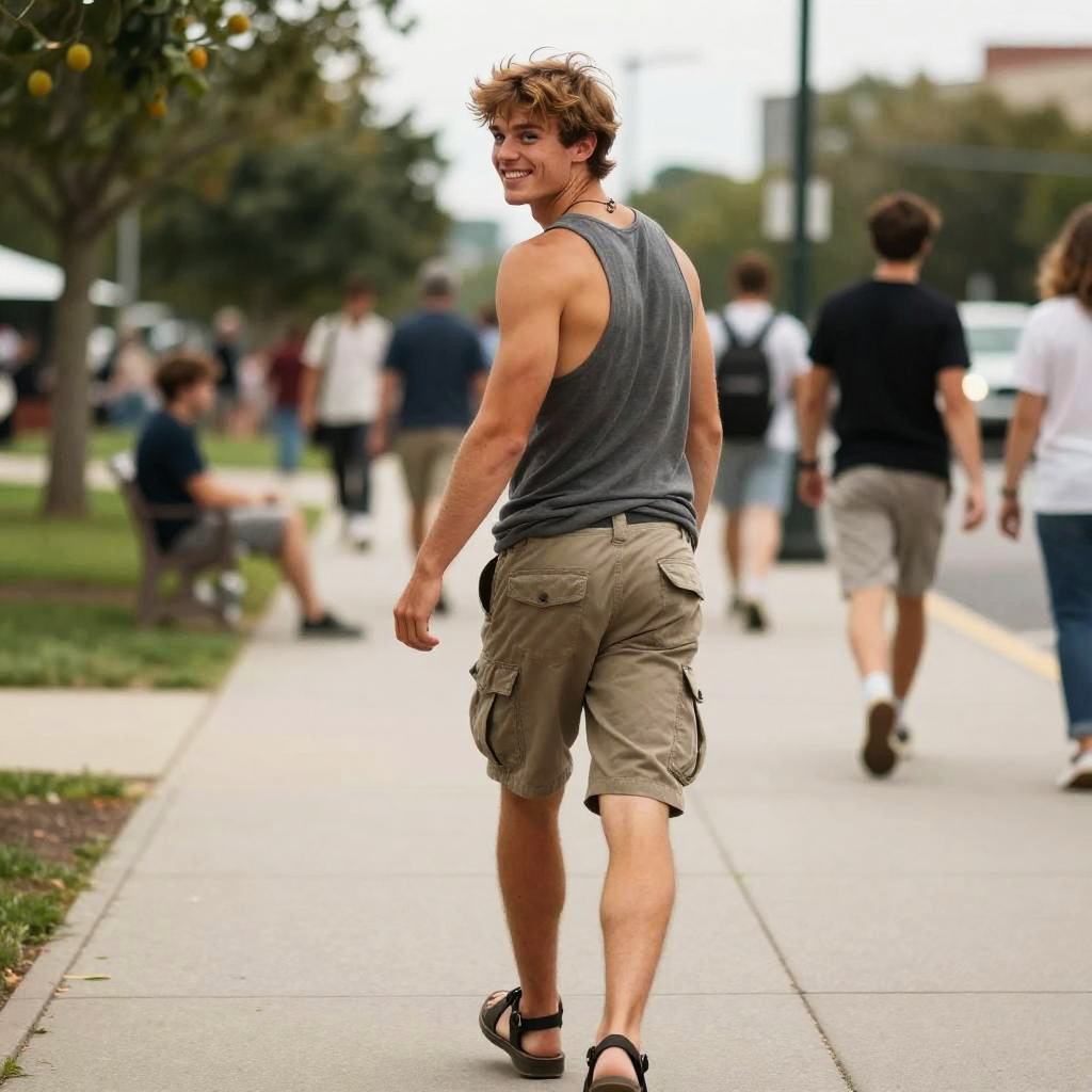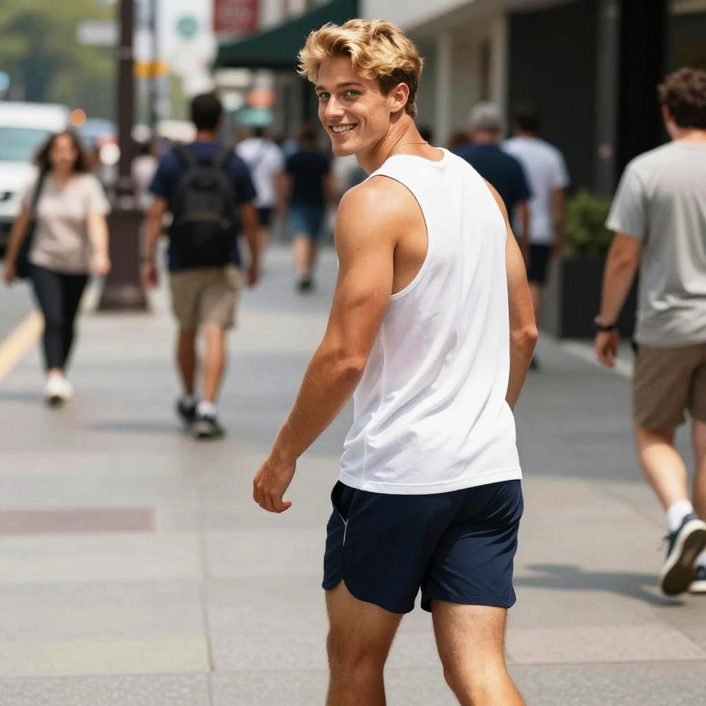 Rear view of a athletic, lively young man, age 22, walking on a busy sidewalk, looking back over his shoulder with a big smile. He has a square, strong jawed face with short sandy blonde hair and green eyes. Dressed in a white tank top, navy athletic shorts, running shoes, he exudes a youthful, chic vibe. Captured on a sunny day with a bustling urban backdrop, the scene highlights his muscular build, tanned skin, confident posture. Shot in high resolution, with a focus on dynamic, fluid movement and detailed facial expression for a realistic, professional photo.