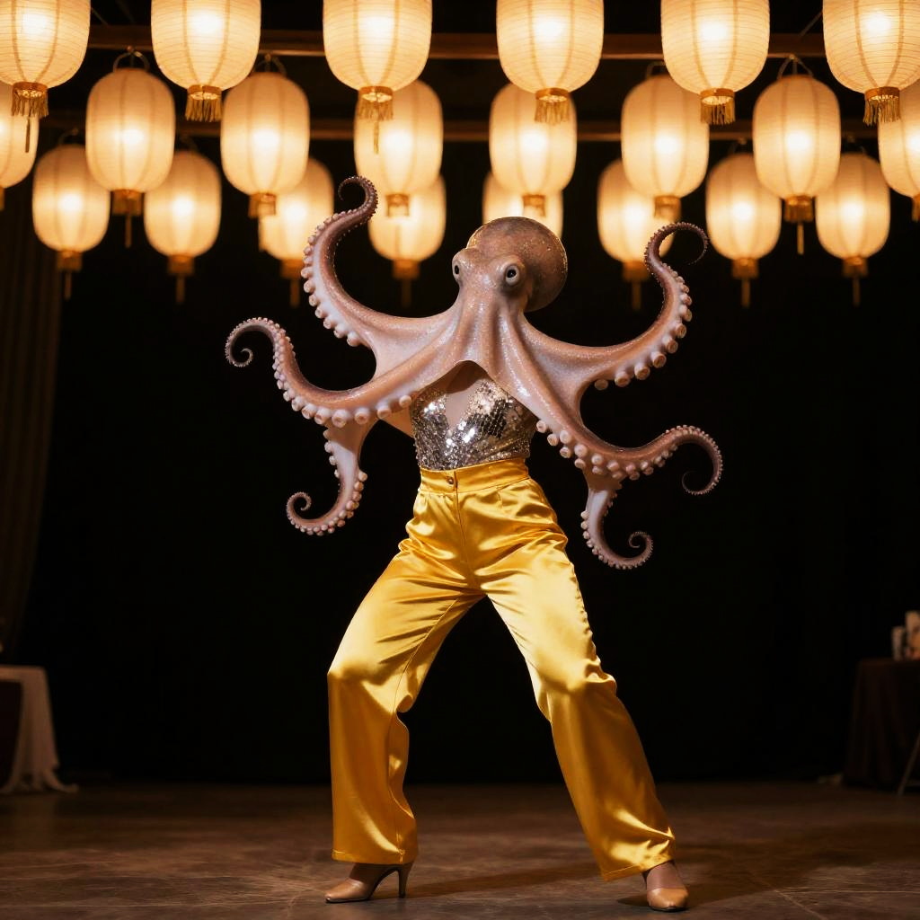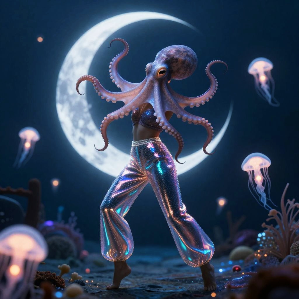 Octopus humanoid dancing under crescent moon with jellyfish lanterns