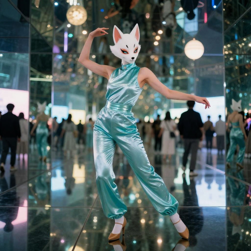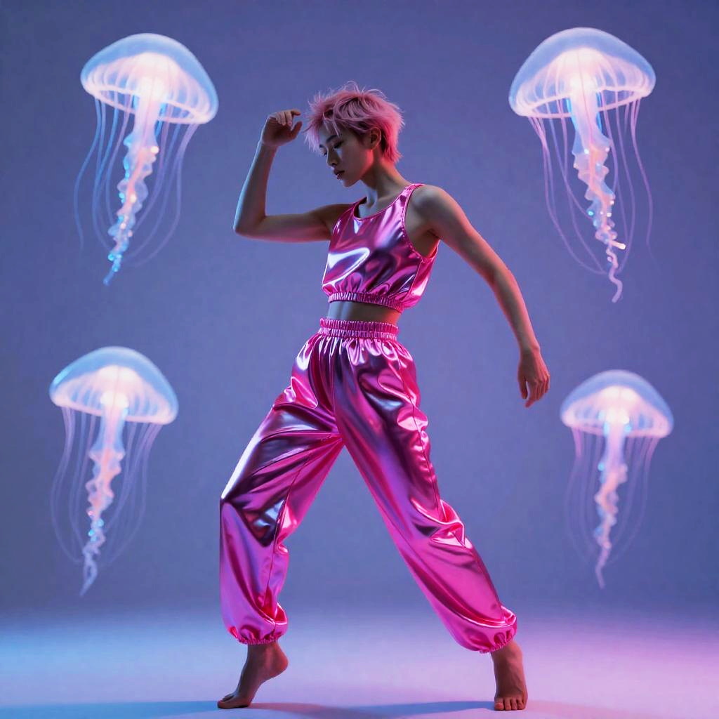 Bioluminescent octopus in holographic seafoam high-waisted disco pants, dancing under a crescent-moon tidal pool dotted with floating jellyfish lanterns