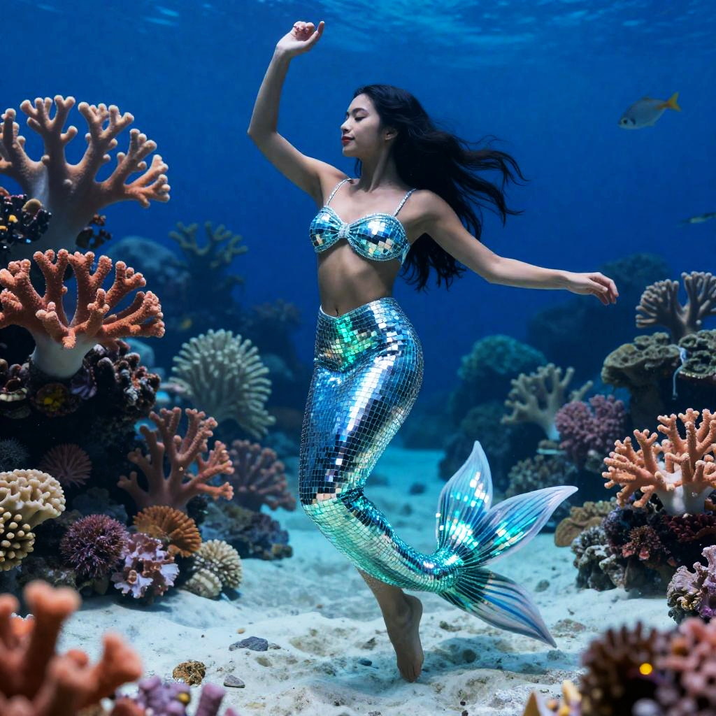 A bioluminescent octopus-headed humanoid figure dressed in holographic seafoam high-waisted disco pants and a matching top, dancing gracefully on an underwater seabed. The scene is illuminated by a large crescent moon in the background and surrounded by glowing jellyfish lanterns floating gently in the dark tidal pool environment.