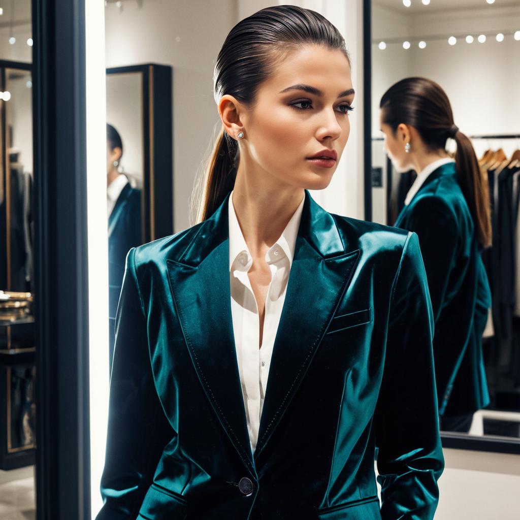Fashion model with Money Piece hairstyle wearing a modern, glossy teal pantsuit and black top walking confidently on an urban street. The model has light skin tone, short blonde hair blown by the wind, and large hoop earrings. The setting includes city buildings and traffic with a fashion editorial style.