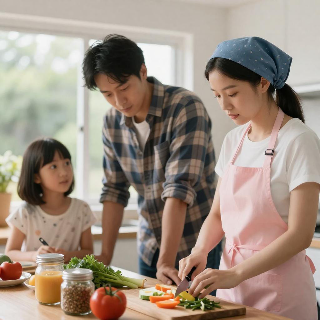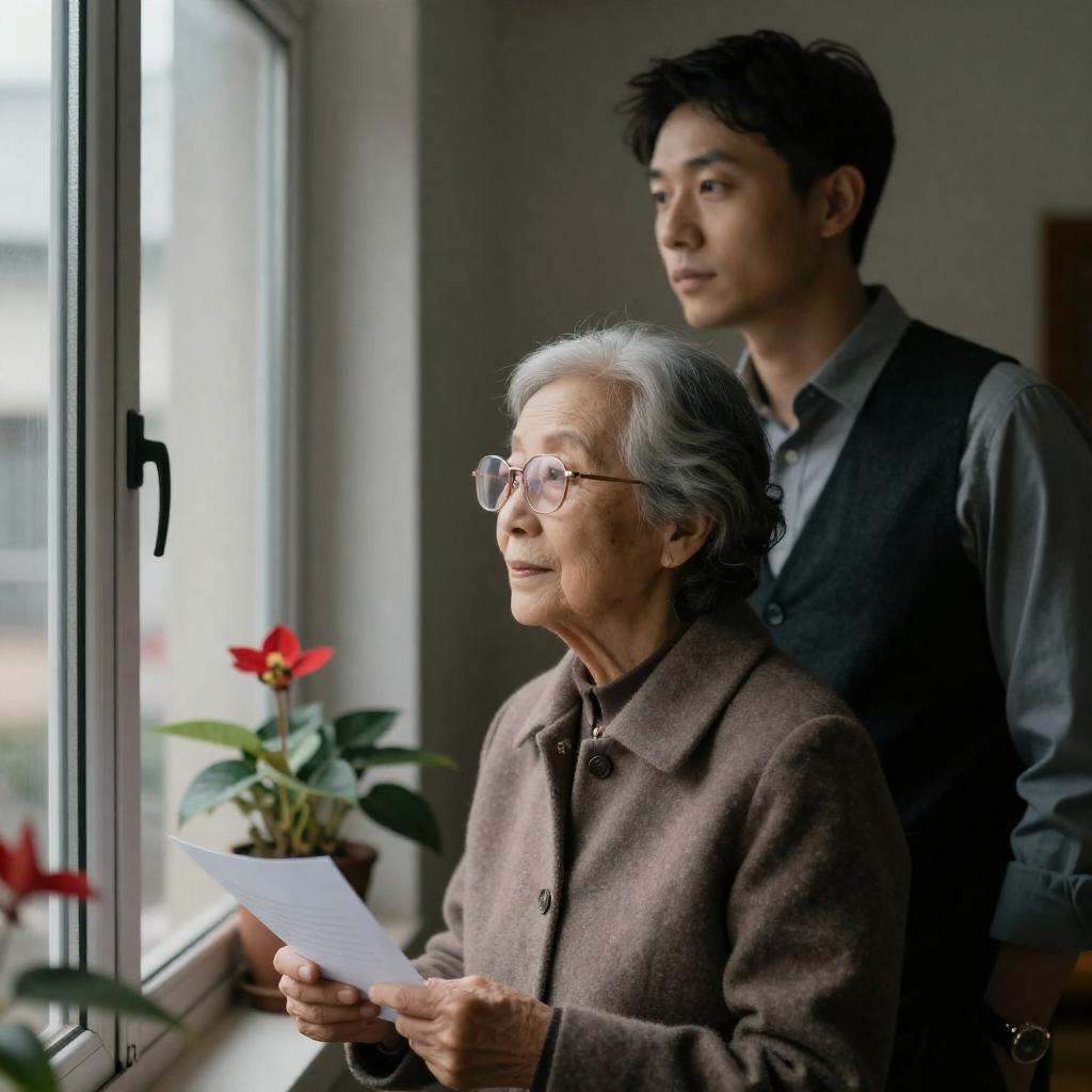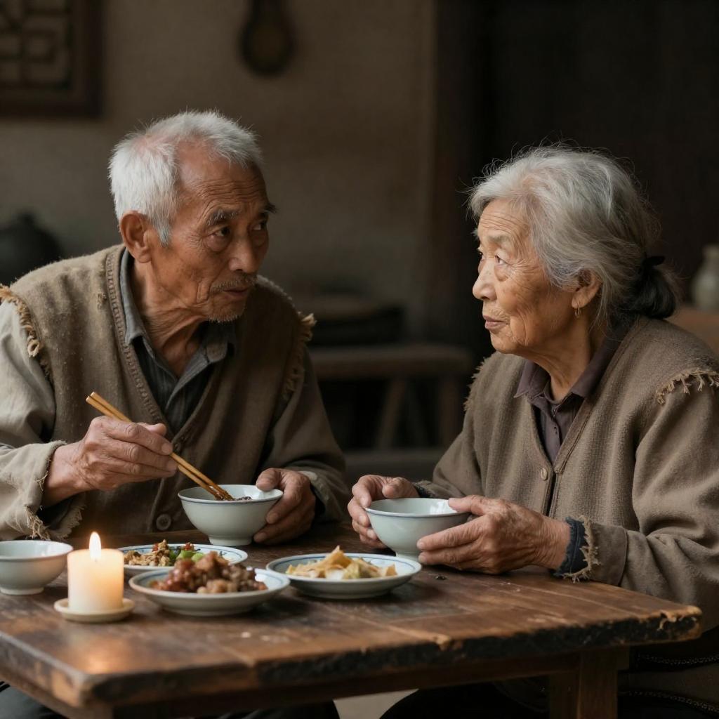 Photograph of two people eating at a table. An older man with gray hair and mustache wears a dark shirt, holding chopsticks, looking down. A woman with black hair and brown cardigan wears a white turtleneck, looking at him. Table with bowls of soup, dumplings, and chopsticks. Background includes window and interior walls.