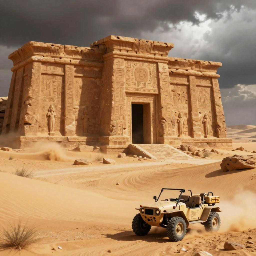 Damogran, depicted as a barren desert planet with swirling sandstorms, colossal ancient temples built from sandstone, intricate alien hieroglyphics glowing faintly, a rugged rover vehicle traversing the harsh landscape amidst ominous thunder clouds.