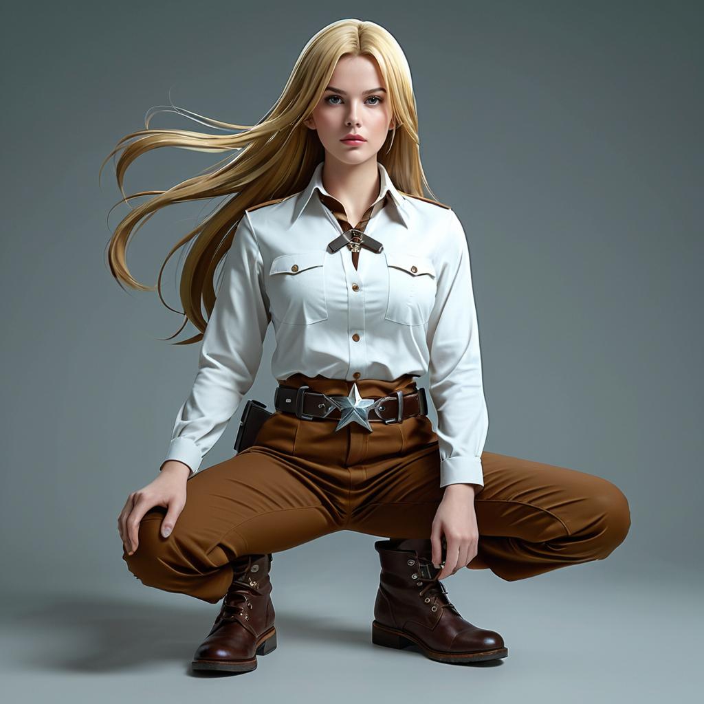 Aot style, shingeki no kyojin, christa renz, 1girl, belt, belt buckle, blonde hair, blue eyes, brown footwear, brown pants, buckle, chest belt, collared shirt, diamond (shape), floating hair, from side, full body, grey background, hair between eyes, hands on own thighs, long hair, long sleeves, looking ahead, own hands together, pants, parted lips, shirt, shoes, sitting, solo, sparkle, star (symbol), thigh strap, white shirt, ((masterpiece)), best quality