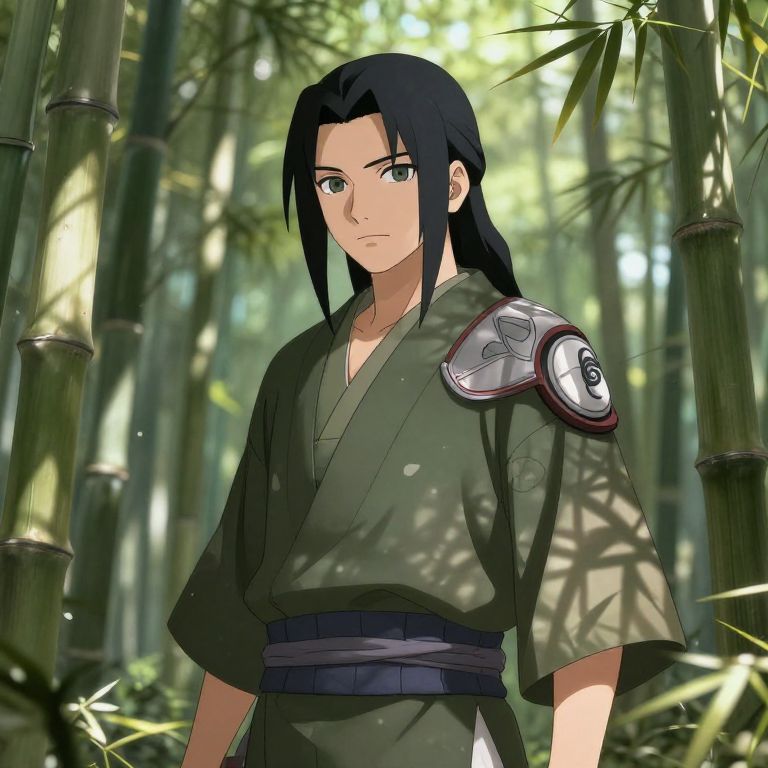 Anime-style digital drawing of a serious, black-haired man in a green kimono with a metal shoulder guard, standing in a sunlit bamboo forest.