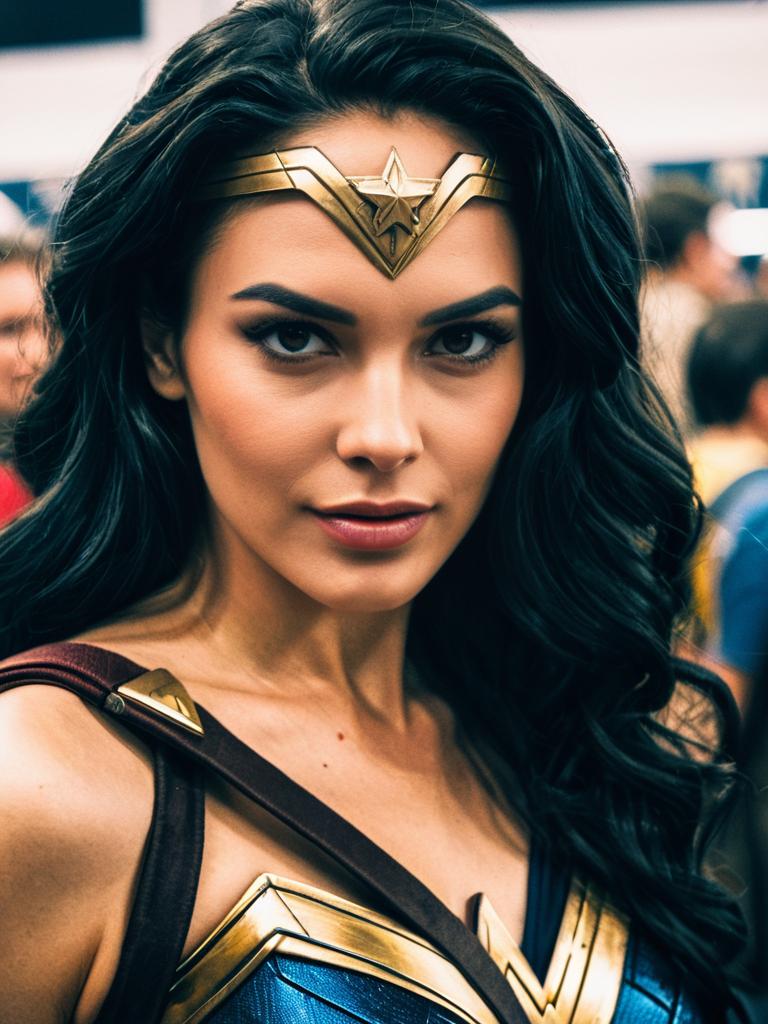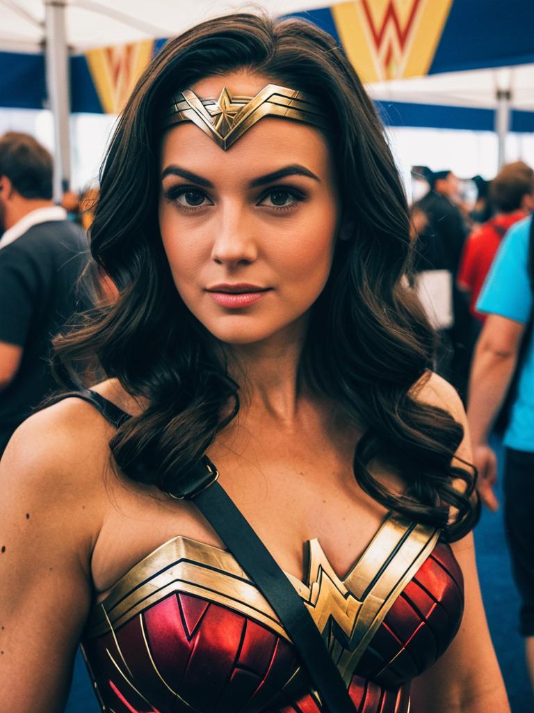 Woman in Wonder Woman costume, cosplay festival portrait, realistic detail