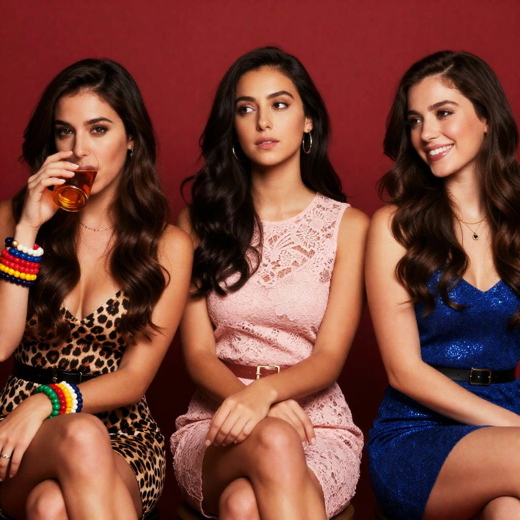 Photograph of two women sitting back-to-back on a heart-shaped metal chair. The woman on the left has dark hair, red top, and polka-dot skirt, laughing with head tilted back. The woman on the right has light brown hair, pink dress, smiling. Background has red silhouette city buildings. Both women have fair skin.