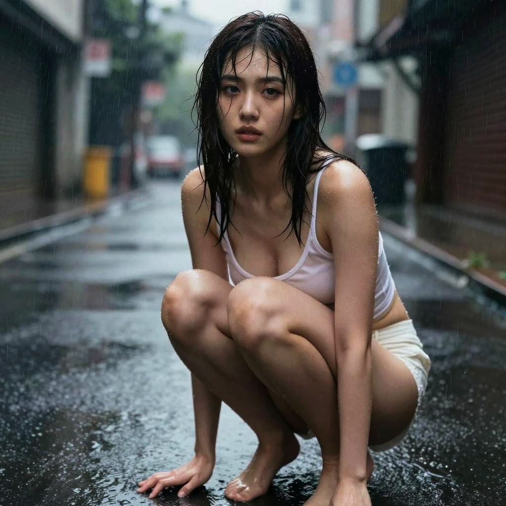 Photorealistic image of a young Asian woman with medium-short dark brown wet hair and large eyes, squatting barefoot on a wet street during heavy rain. She wears a white tank top and light shorts, showcasing detailed skin and cloth textures. The setting is an urban alley with blurred background, moody cinematic lighting, and visible raindrops.