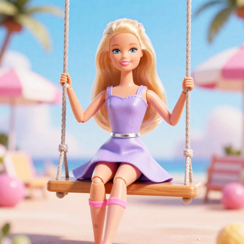 (masterpiece, best quality), highres, (8k, RAW photo, highest quality), ultra-realistic, 3d, centered, (TS_Barbie), mid shot, (full body:1.2), beautiful, a blonde barbie girl sitting on a swing in a lavender dress with silver belt in the style of pixar, (legwarms), pink heels, pink stockings, stockings, tattoo, (perfect lighting and composition:1), soft lighting, (high detail, 8K resolution:1), hdr:0.7, detailed face, perfect, (dynamic), pose, (high quality:1.2), plastic skin, ((shiny:1.3)), hourglass figure, smile, (depth of field:0.8), 50mm, film grain:0.7, fujifilmXT3, focus face, looking at viewer, (detailed eyes), floating particles, analog style, light makeup, lipstick, (thick waist, thick arms, thick thighs:0.6), summer vacation, amazing composition, lively, ((volumetric lighting)), halation:0.5