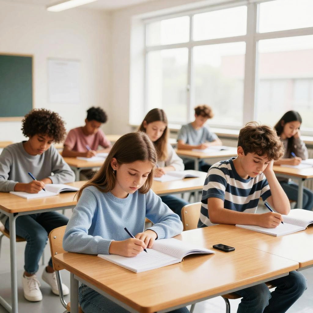Photograph of a classroom scene. A middle-aged woman with dark hair, glasses, and a beige blouse stands in front of a blackboard writing with white chalk. She's facing a group of students, some with dark hair, seated at desks. The classroom has gray brick walls, a whiteboard, and fluorescent lighting. Students are casually dressed, some with backpacks on the floor.