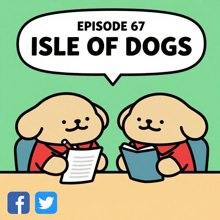 Cartoon of two smiling, beige dogs in red shirts reading papers at a desk, speech bubble says "EPISODE 67 ISLE OF DOGS