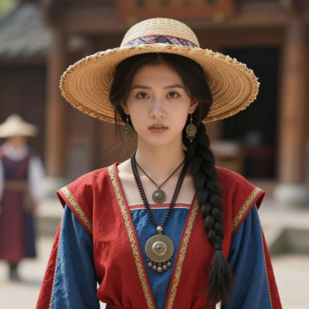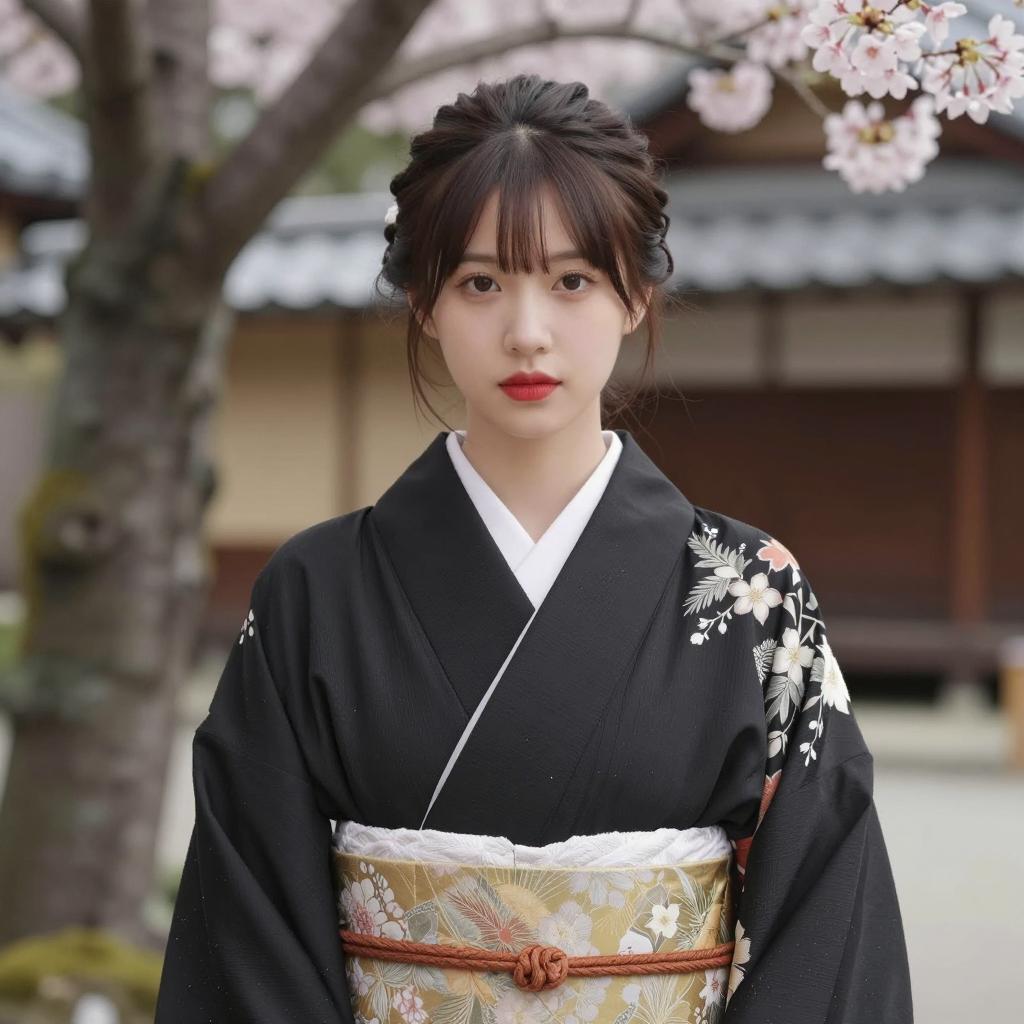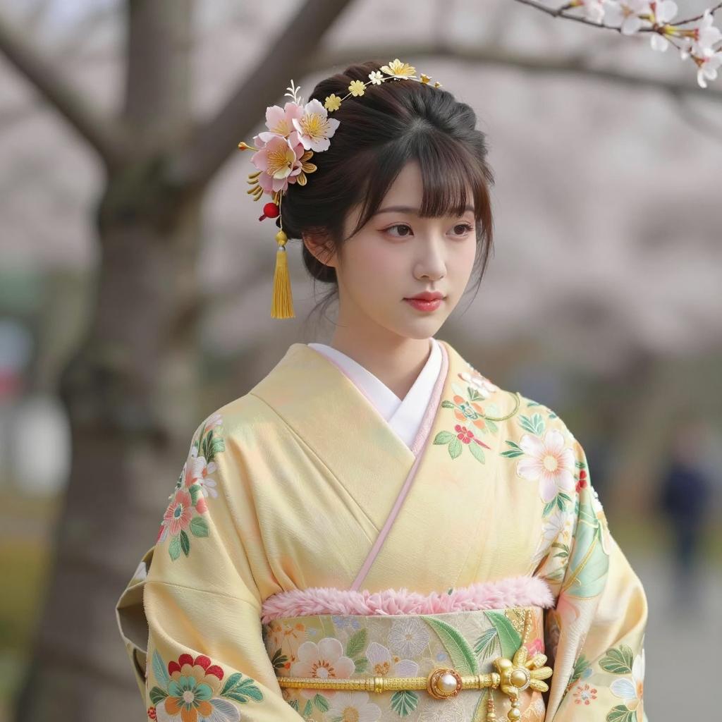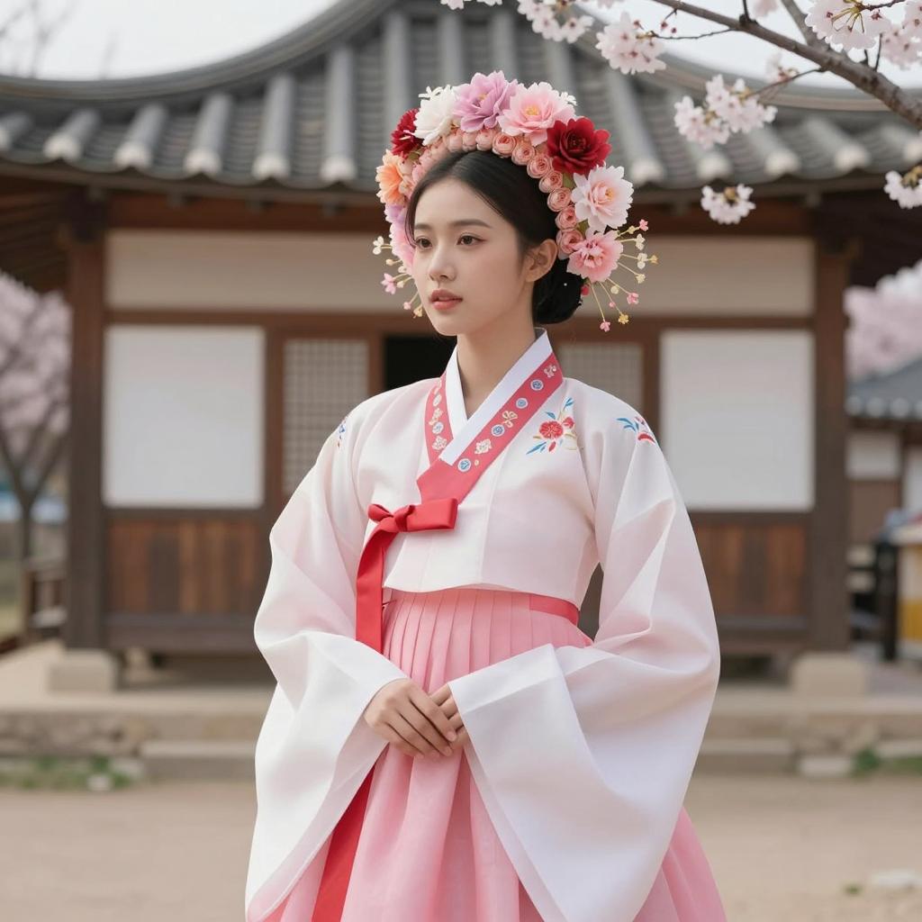 Costume spring festival, photorealistic portrait, young woman, East Asian, long black braids, floral headpiece with yellow and pink flowers, white traditional Korean dress with pink embroidery, blue scarf, brown sash, neutral expression, background: blurry traditional Korean building with tiled roof, cherry blossom trees, outdoor, natural light, slightly shallow depth of field, realistic ures, vibrant colors