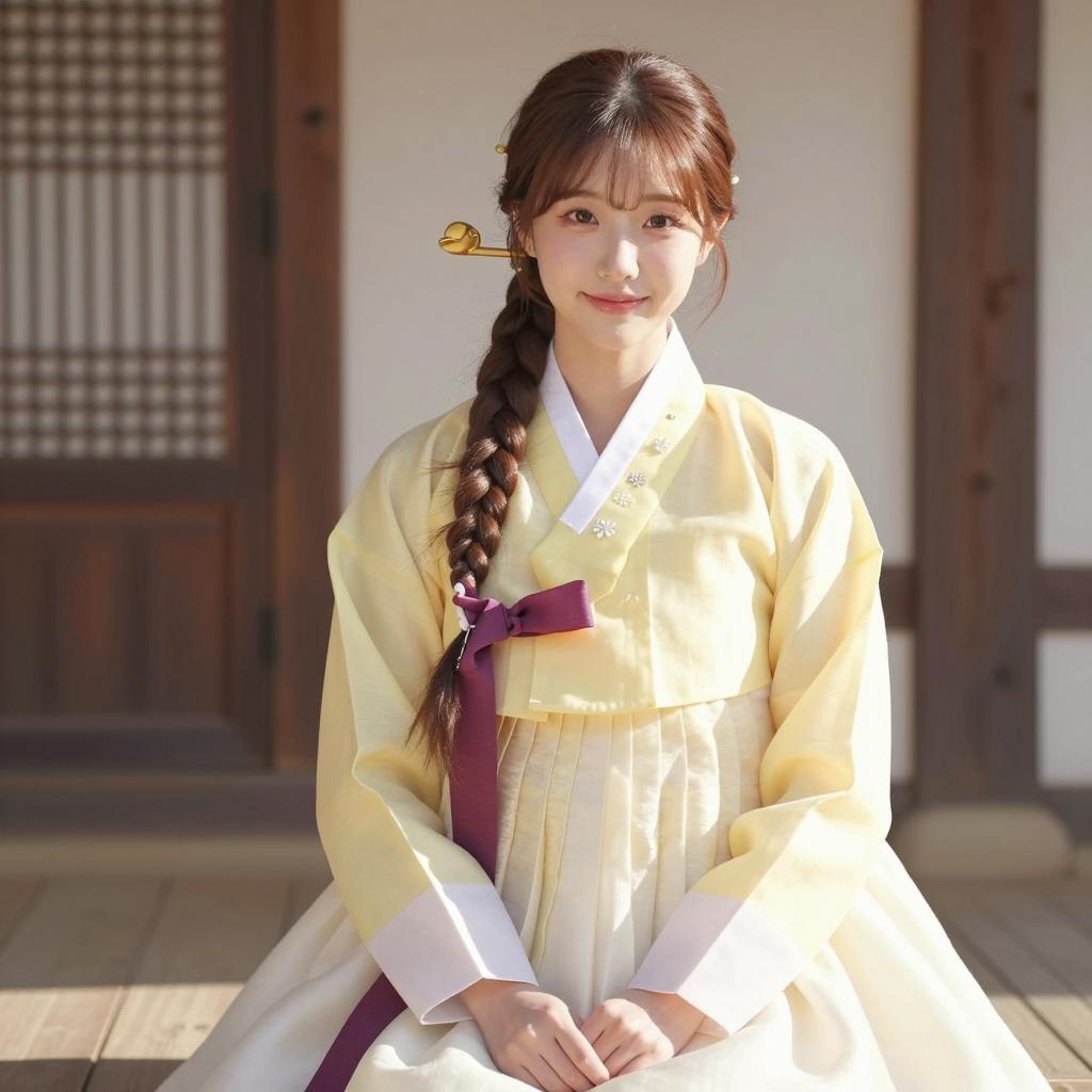 Photorealistic portrait of a young East Asian woman wearing a white traditional Korean hanbok featuring pink embroidery, a blue scarf, and a brown sash. She has long black braids adorned with small flowers and a floral headpiece with yellow and pink flowers. The background shows a blurry traditional Korean building with a tiled roof and cherry blossom trees, captured outdoors in natural light with vibrant colors.