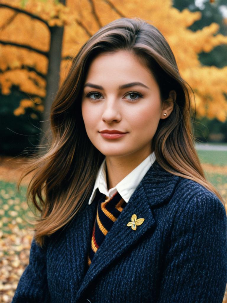 Woman in Preppy Fall Outfit, photorealistic studio portrait, autumn colors
