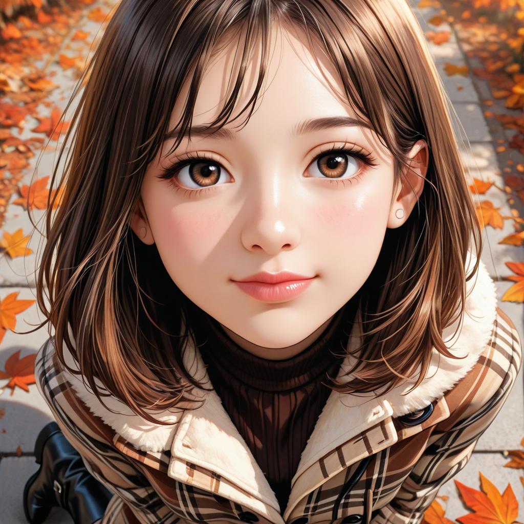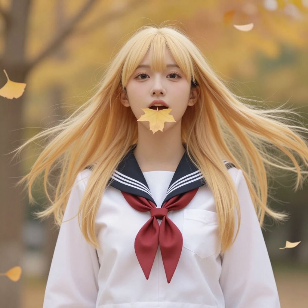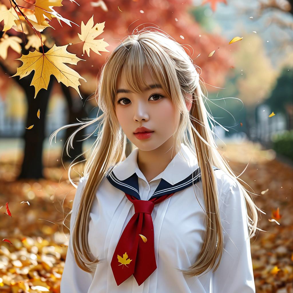 Digital anime-style portrait of a blonde girl with large eyes, wearing a white sailor uniform with a red bow, surrounded by autumn leaves in a sunlit