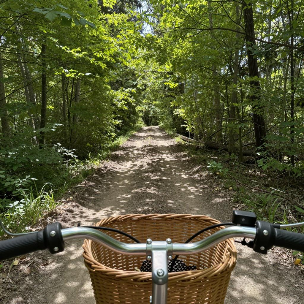 View of a forest dirt path surrounded by dense bright green foliage and trees. The handlebars of a bicycle with a wicker basket and black mesh are visible in the foreground. Sunlight filters through the leaves creating a natural tunnel effect along the trail.