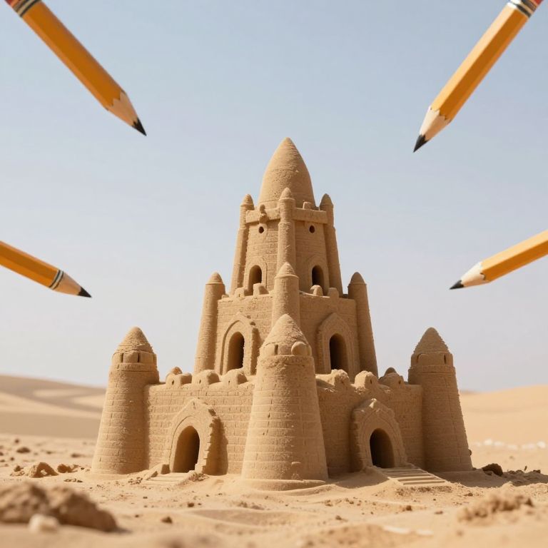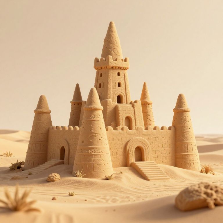 Owl perched atop a towering sandcastle, its intricate structure resembling a natural formation with a central cave-like opening, set against a backdrop of rolling waves and distant mountains under a partly cloudy sky.