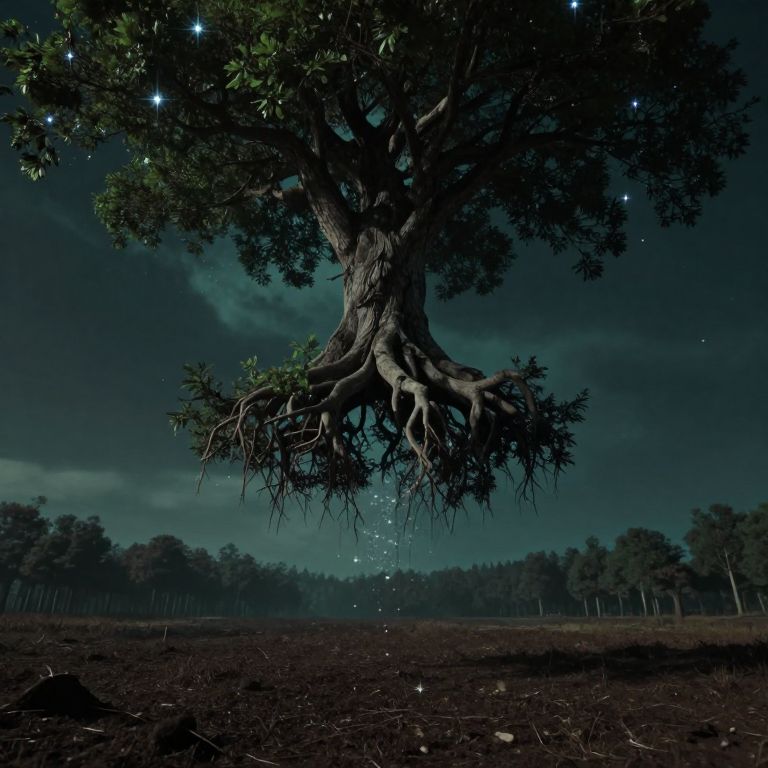 An ancient tree grows upside-down with its roots in the heavens, spewing stars into a soilless forest below where gravity behaves backwards.